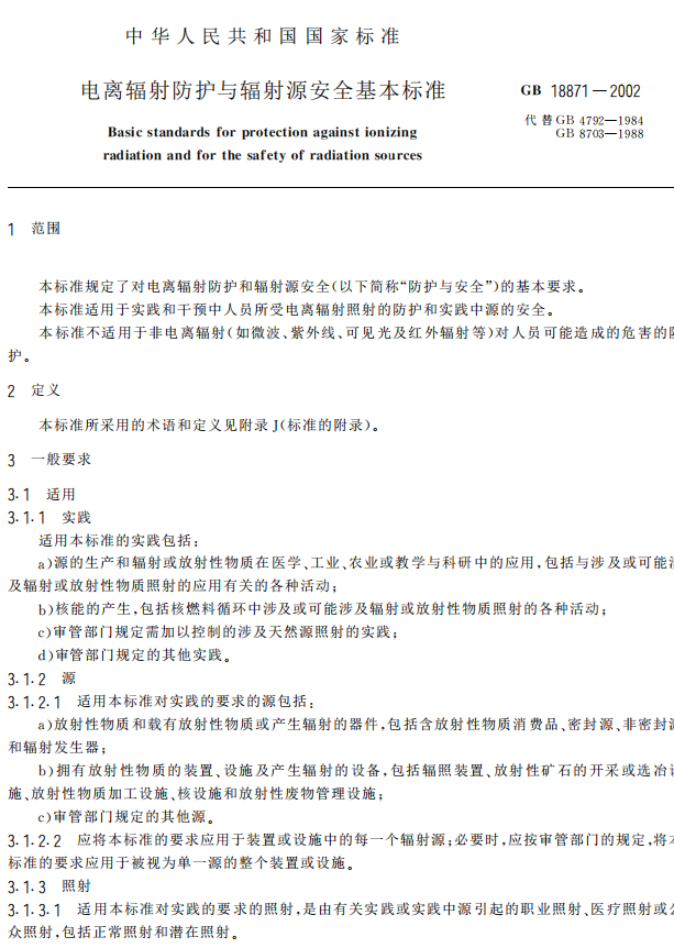 本標準的全部技術(shù)內(nèi)容均為強制性的) 本標準是根據(jù)六個國際組織*即+聯(lián)合國糧農(nóng)組織,國際原子能機構(gòu),國際勞工組織,經(jīng)濟合作與發(fā) 展組織核能機構(gòu),泛美衛(wèi)生組織和世界衛(wèi)生組織-批準并聯(lián)合發(fā)布的.國際電離輻射防護和輻射源安全 基本安全標準/*國際原子能機構(gòu)安全叢書 001號20334年版-對我國現(xiàn)行輻射防護基本標準進行修訂 的2其技術(shù)內(nèi)容與上述國際組織標準等效) 依據(jù)上述國際組織標準對我國現(xiàn)行輻射防護基本標準進行修訂時2還充分考慮了我國十余年來實 施現(xiàn)行輻射防護基本標準的經(jīng)驗和我國當前的實際情況2保留了現(xiàn)行標準中實踐證明適合我國國情又 與國際組織標準相一致的那些技術(shù)內(nèi)容) 本標準自發(fā)布之日起2同時代替 567839:03;7和 56;8<=:03;;) 本標準的附錄 >,附錄 6,附錄 ?,附錄 @,附錄 A,附錄 B和附錄 C是標準的附錄2附錄 5和附錄 D 是提示的附錄) 本標準由*以部門名稱筆畫為序-中華人民共和國衛(wèi)生部,國家環(huán)境保護總局和原中國核工業(yè)總公 司聯(lián)合提出) 本標準起草單位+聯(lián)合編制組2編制組秘書單位為核工業(yè)標準化研究所) 本標準主要起草人+潘自強*以下以姓氏筆畫為序- 葉常青,張延生,吳德強,鄭鈞正,金家齊,夏益華,禚鳳官)