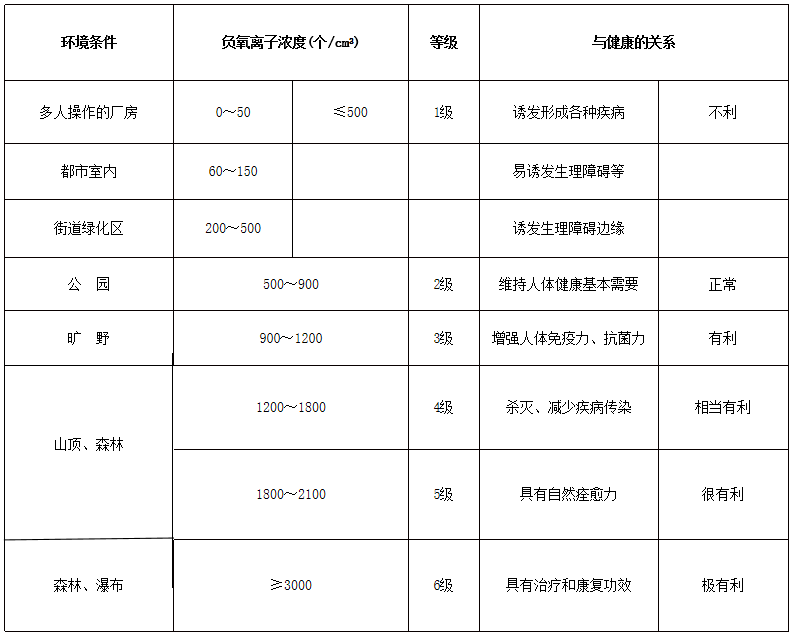 根據(jù)世界衛(wèi)生組織的規(guī)定,新鮮空氣中陰離子的標(biāo)準(zhǔn)濃度不得低于1500/cm3。